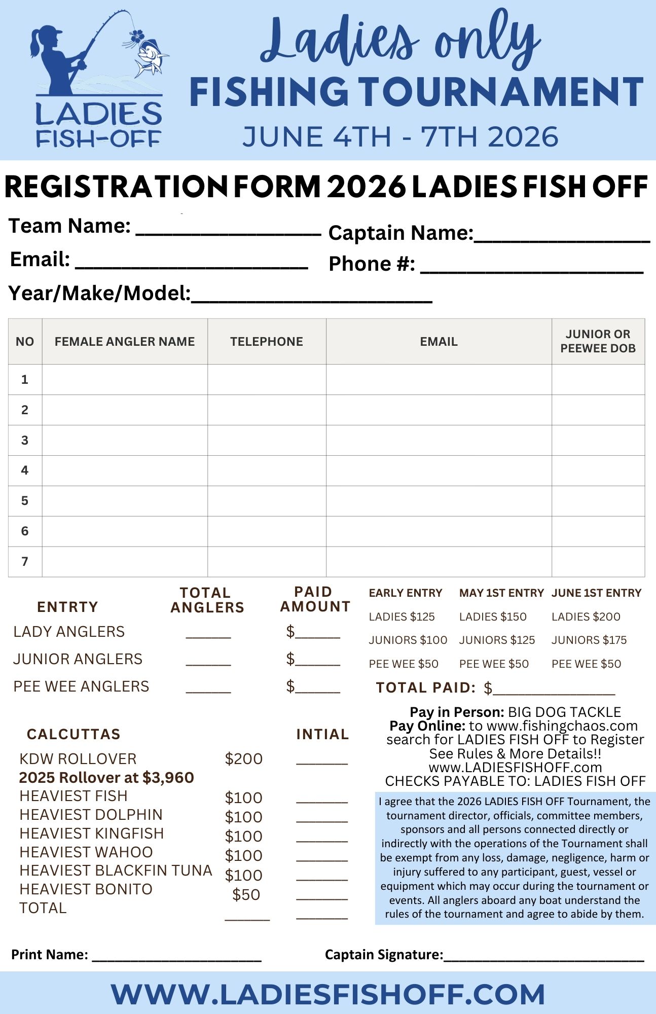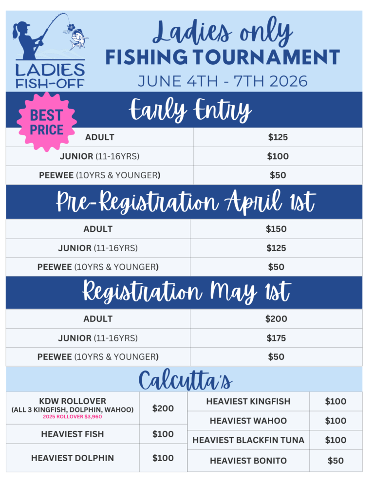 REGISTRATION is NOW OPEN! EARLY ENTRY SAVINGS! REGISTER NOW! orIn person: at Big Dog Tackle 2025 KDW ROLLOVER is at $3,960! REGISTER ONLINE HERE Tournament Rules Registration Form